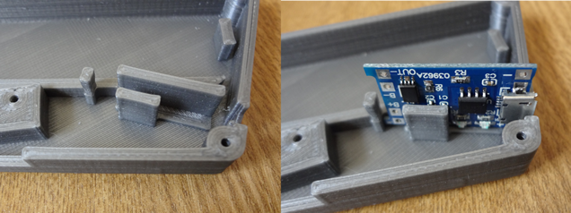 The same applies for the charging / protection module TP4056; it should fit between the plastic walls and the groove in the body (Figure 9).