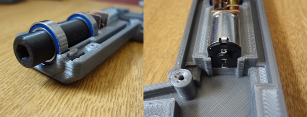 To mount the motor, bit adapter and ball bearings, just slide the bearings into the adapter and then insert the motor shaft in the corresponding end. The process is straight-forward. The printed body has grooves for the bearings and a cavity for the motor and gears; the fit is precise so there is no play that could compromise the proper screwdriver operation (Figure 6).