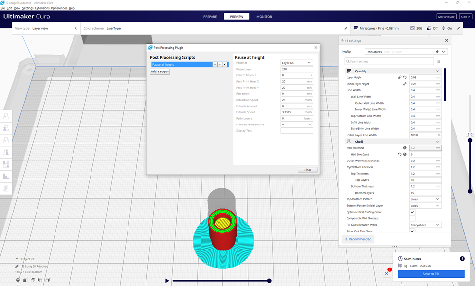 The process to embed an object into a 3D printed part requires the printer to pause at a certain layer so the user can put the object, then resume printing. Many slicers will have this option included as a Post Processing Script. In CURA, this script is “Pause at Height”; I am using a 0.08 mm layer height, so I ask the printer to pause at layer 210, and move the head out of the way (Figure 4).