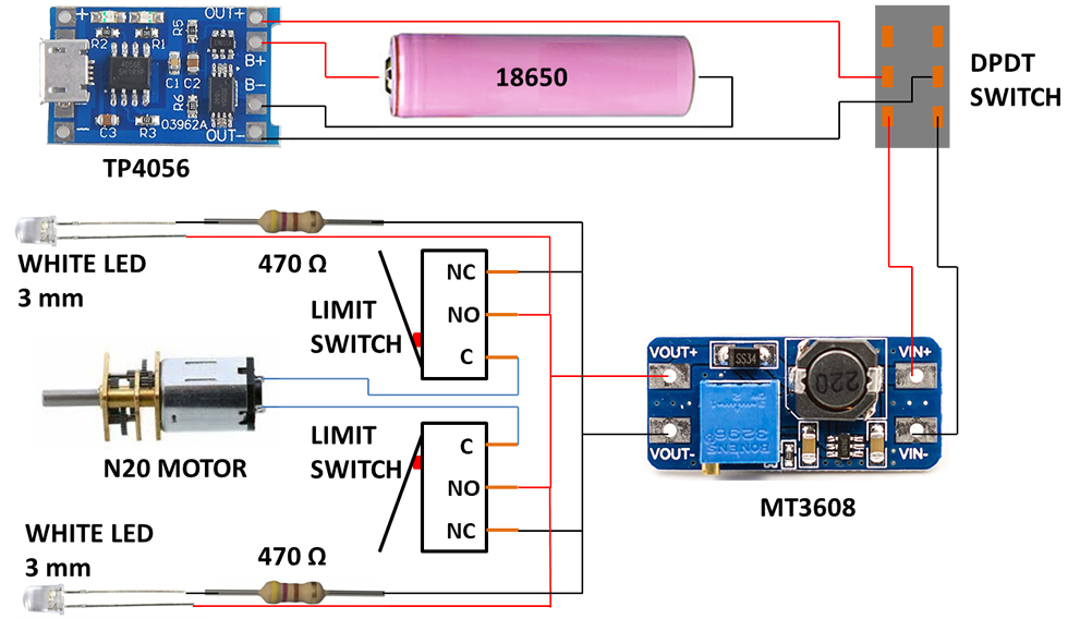 You may wonder why the main switch is required. The boost converter draws power from the battery even if the motor is not running, so it needs to be disconnected when not in use. In addition, it is always recommended to have any load disconnected from the battery while it is being charged, so the TP4056 can properly sense the charge current and avoid overcharging.