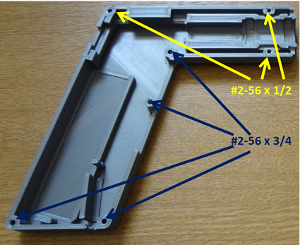 The screws for the switches are #2-56 x 3/8. They are slightly smaller than the diameter of the holes in the switches, so there is room for adjustment. With both switches and the trigger in place move them until the metal levers just touch the trigger at both ends; this guarantees the maximum movement without leaving the trigger loose. Once this is done, tighten the 4 screws.
