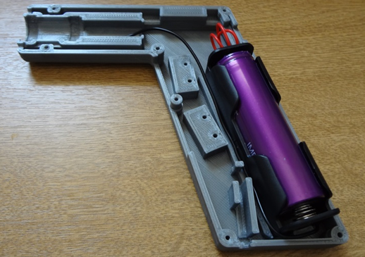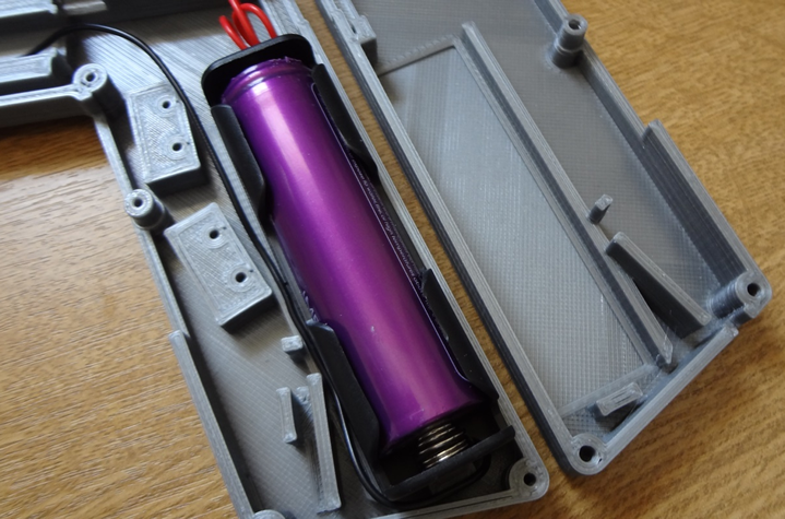 This holder does not require any additional adhesive to remain secure in place; with the battery in, the other cover will apply the right amount of pressure to prevent them from moving. In addition, the left cover has a wide groove where the battery touches it, calculated at the right distance to make it a tight fit (Figure 12).