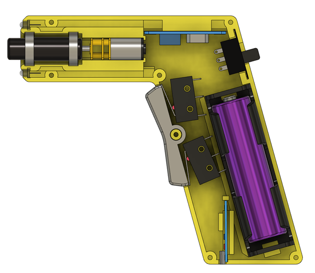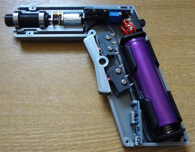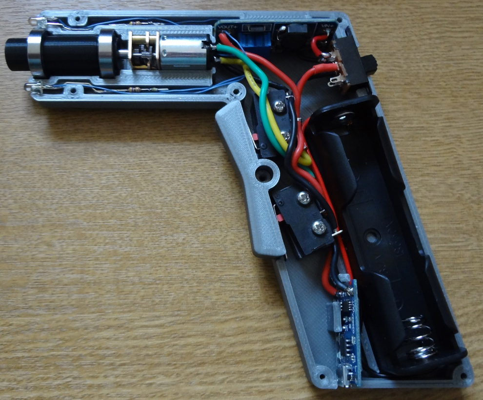 As previously indicated, all parts are widely available as of July 2020. Figure 1 shows an overview of the complete screwdriver with all the parts in place, with the exception of the left body cover, the screws, 2 resistors (for the LEDs) and the wiring: