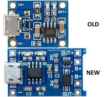 Both include the TP4056 charge control chip, as well as the micro USB input. The difference is that the new board has a current/voltage monitor circuit and a double MOSFET to disconnect the load when a situation of overcurrent or under-voltage is detected. The board is longer to accommodate these 2 additional chips, and there are 4 terminals: B+ and B- to connect the battery, OUT+ and OUT- to connect the load.