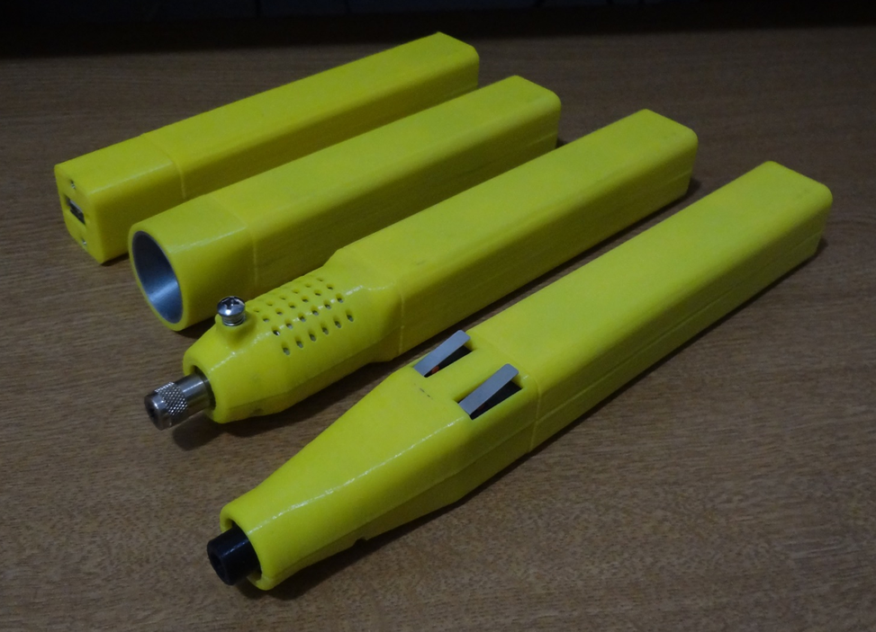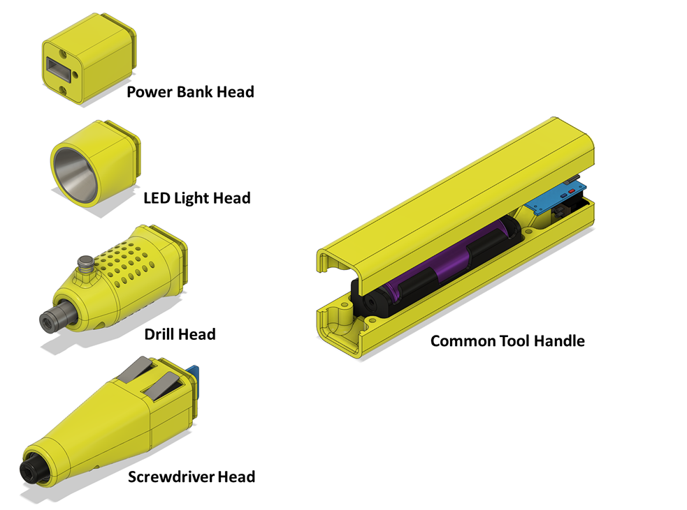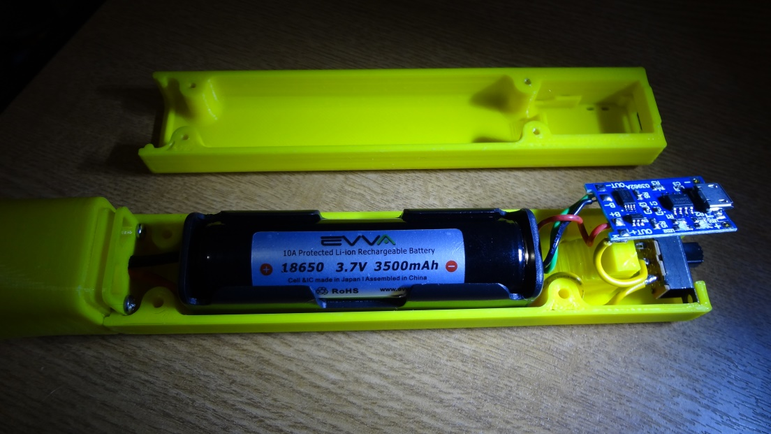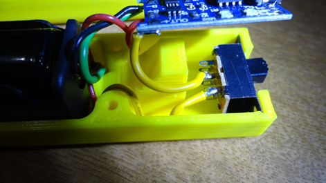 Several portable tools can benefit from having a Lithium-ion battery as the power source; it has high charge capacity and can be recharged using a standard USB port if connected to the TP4056. So we can design (and build) a few tools that can share the same standard handle, which will house the TP4056, the switch and the battery; the load will vary with the application.