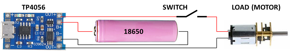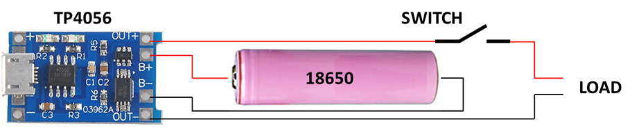 The battery is connected to B+ and B-, while the load goes to OUT+ and OUT-. You may have noticed that I added a switch in the circuit; this is needed to have control of the load. With no switch, the load would be always connected, thus consuming the battery charge. This might be desired in some applications, but keep in mind that the load connected during the charge process may interfere with the current sensing capabilities of the TP4056 and the charge may never end, risking overcharging the battery. Therefore, it is always recommended to disconnect the load when charging the battery; the switch will be useful for this.