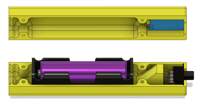 These components will be housed in a 3D printed prism, built in two halves. The rear end will accommodate the switch and the USB port of the TP4056, while the front end is shaped to make a perfect fit with each of the different heads. The battery will be placed in a standard 18650 holder for easy removal if required (it can be soldered in place, but I opted for a more general approach). Figure 7 shows the components placement.