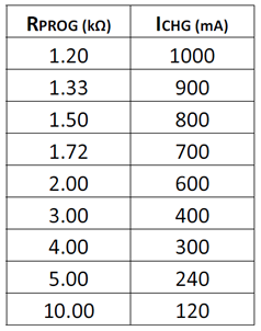 ICHG is the charging current. Substituting with a few values of RPROG we can construct a table (which is usually listed in the TP4056 chip datasheet):
